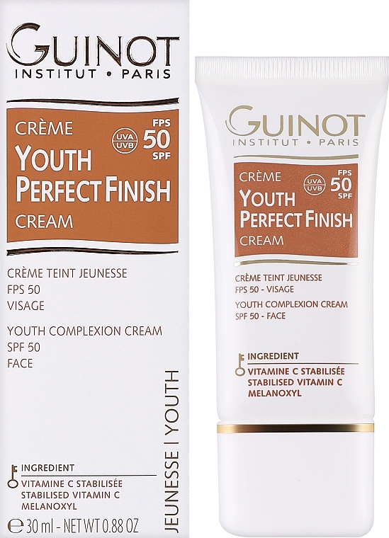 YOUTH PERFECT FINISH SPF 50 : verheldert en egaliseert de teint. Maakt de huid stevig en elastisch met hoge bescherming tegen UV-straling.